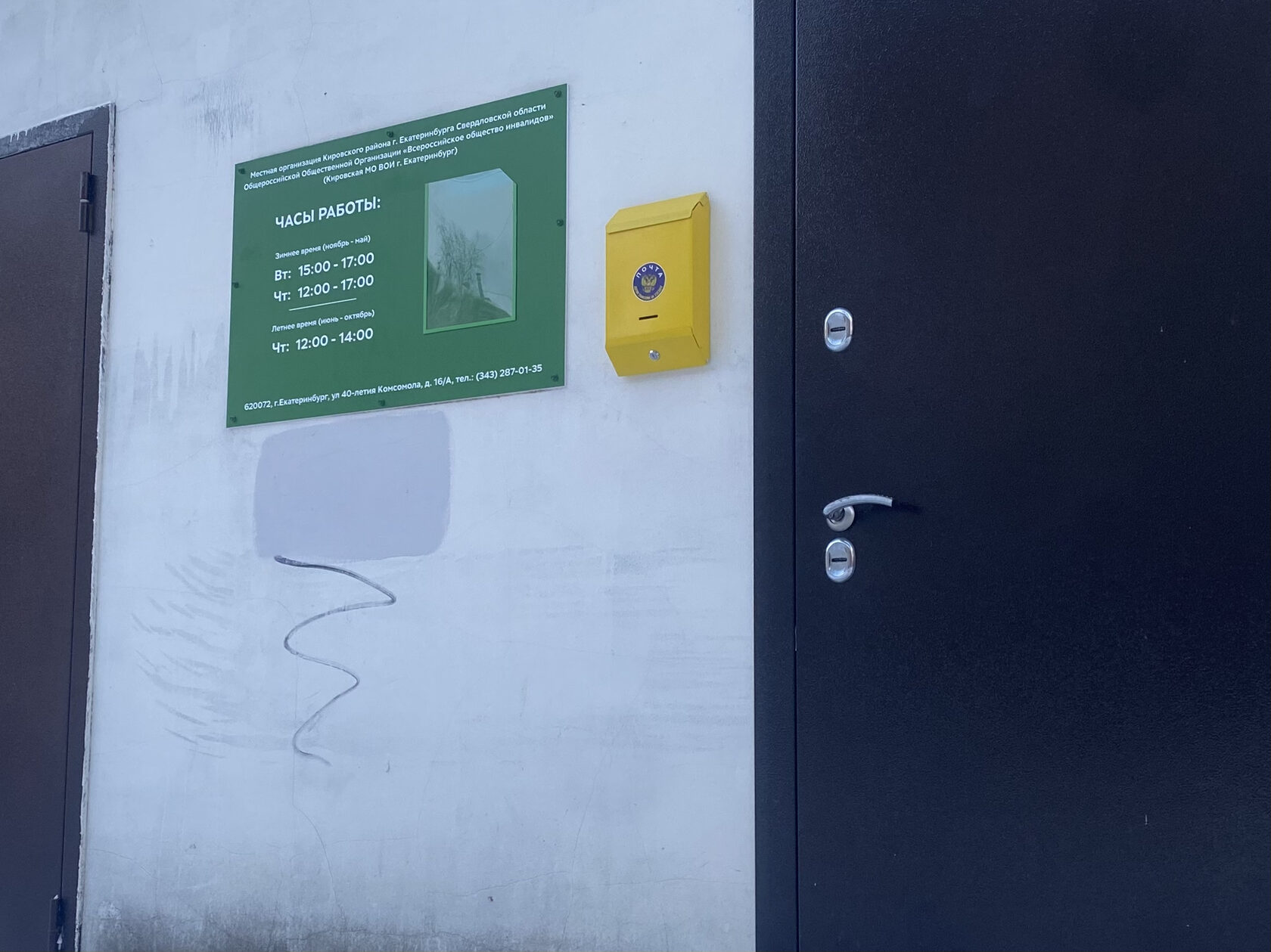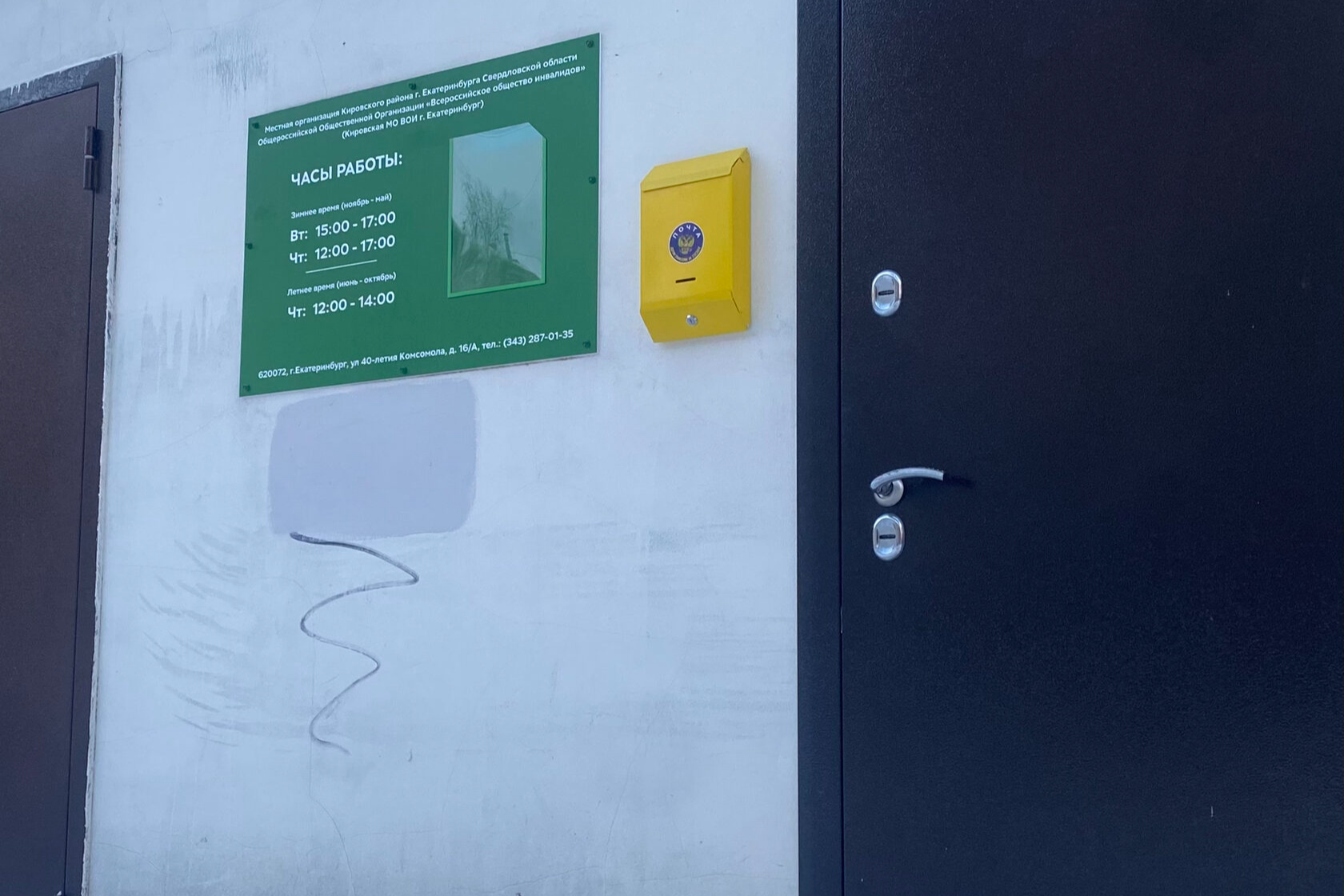 Было решено изготовить новую вывеску, которая бы отвечала всем требованиям членов ВОИ. Теперь на входной группе можно увидеть актуальную информацию об организации, дополнительные сведения и объявления в специальном кармашке и номером телефона для связи.